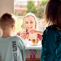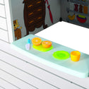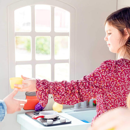 • Door with mail slot and working doorbell, play sink and stove combo, toy food, pans, and utensils included