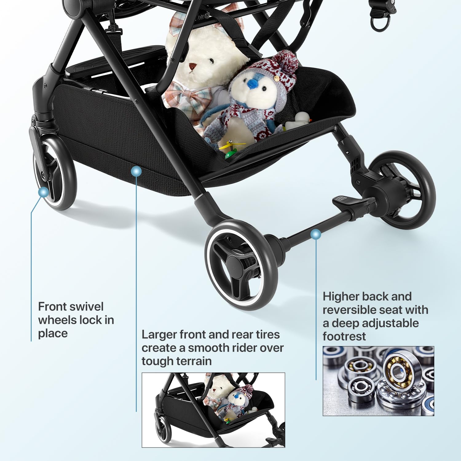 - 【Thoughtful Design】Aluminum alloy frame balances durability and portability. Silent wheels ensure noise-free strolling, while the ergonomic handlebar suits parents of all heights.