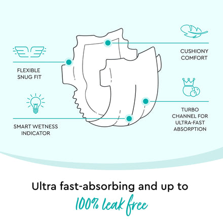 • No more wetness and irritation: Get cushiony comfort with our ultra fast-absorbing diapers. Enjoy up to 100% leak-free days and nights.