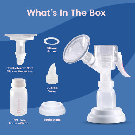 • LIMERICK'S LOVE HAND PUMP is a portable and silent breast pump ideal for mothers in need of a quick pump while on the go. Includes a ComforTouch silicone breast cup assembly, a 4oz/120mL BPA-free bottle, bottle cap, silicone gasket, and bottle stand. Dishwasher safe