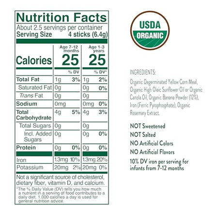 Details: Soft melt-in-the-mouth sticks of puffed organic corn sprinkled with banana that little hands can hold, and mini mouths devour. Perfect for safe self-feeding.