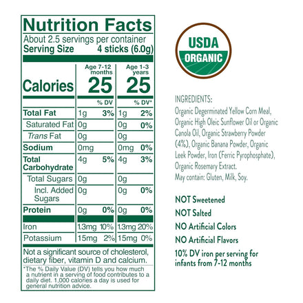• Soft melt-in-the-mouth sticks of puffed organic corn sprinkled with strawberry that little hands can hold and mini mouths devour. Perfect for safe self-feeding. Or licking. Or smooshing.