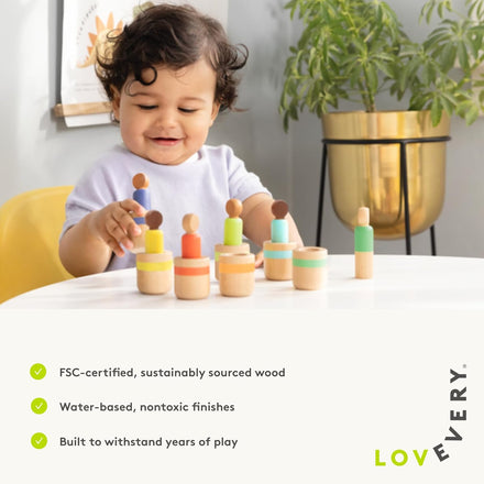 Lovevery Post & Play Peg People Baby Toy, 7 Wooden Peg Doll Practice Color Matching, Stacking, and Balancing, Ages 13 Months +