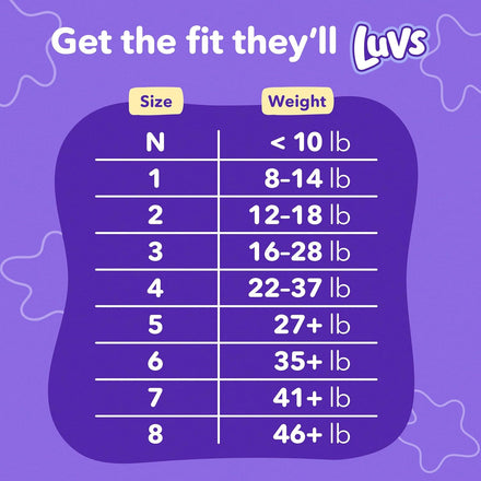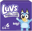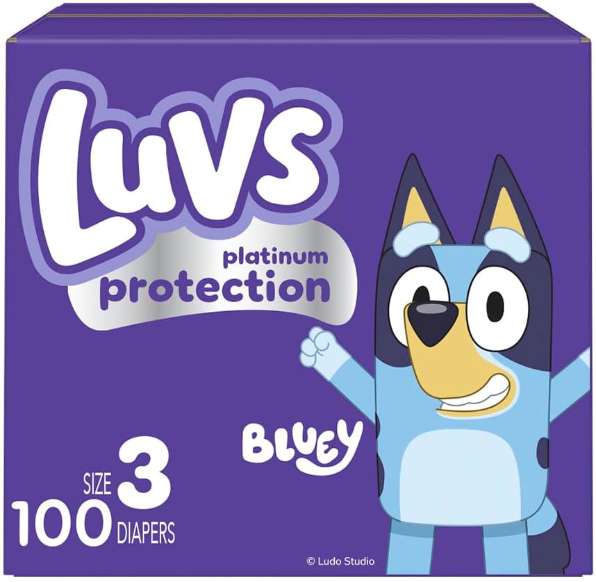 Introducing Luvs Platinum Protection diapers featuring Bluey! Luvs disposable diapers have up to 12-hours of Triple Leakguard Protection, but our leak protection doesn’t stop there, the secure cuffs and stretchy sides keep leaks locked in where they happen the most. Feel the softness and bring a new level of comfort for baby’s delicate skin. Parenting can be stressful. Rest assured with worry-free Luvs Diapers and give your baby the gentle comfort he/she needs with the name brand protection that parents trust. With Luvs Platinum Protection diapers you know when they go, thanks to a wetness indicator that turns blue on contact with wetness. Plus, meet our best friend, Bluey. These adorably fun patterns give these diapers an added layer of cuteness to match your baby. Here are the highlights: Four levels of protection: Triple Leakguards, wetness indicator, secure and stretchy sides, comfy leak barrier cuffs Max softness: Soft and comfy for your baby’s delicate skin It’s not a mystery that babies are pretty delicate, so these diapers are dermatologically tested, hypoallergenic, and free of parabens and latex.** Any fuss? Trust us with our money back guarantee. We think you’ll be wondering how you ever got by without these baby diapers, but if you’re not loving Luvs for any reason, we’ll send you a refund***. Luvs Platinum Protection Baby Diapers are available in sizes N-8. Size newborn (<10 lb), size 1 (8-14lb), size 2 (12-18 lb), size 3 (16-28 lb), size 4 (22-37 lb), size 5 (27+ lb), size 6 (35+ lb), and size 7 (41+ lb), size 8 (46+ lb). *vs. Base Luvs. ** No Natural rubber. ***If you’re not completely satisfied, please send the original receipt and UPC to us within 45 days of purchase for a full product refund via prepaid card. Limited to one redemption per household or name. For additional details, please call 1-888-665-3257.