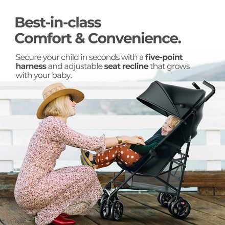 • Cuddle in Motion: Ensures your child's comfort with multi-recline positions, perfect for on-the-go naps. The Trek Lite compact stroller features a large UPF 50+ canopy for protection and a five-point harness for safety, adjusting easily as your child grows