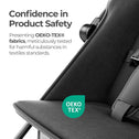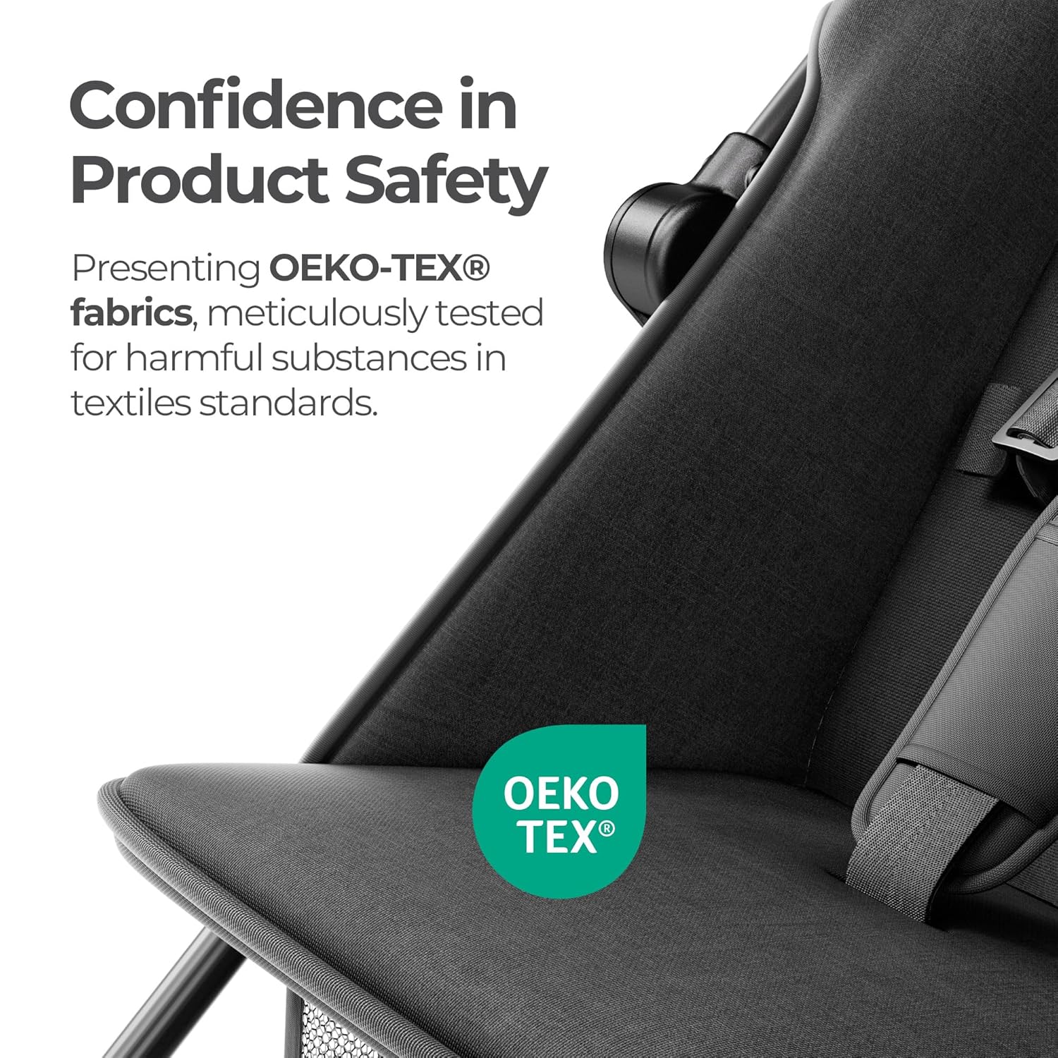 Five-point harness and buckle are relatively simple to use. Presenting OEKO-TEX fabrics, meticulously tested for harmful substances in textiles. The large, easy-access basket holds up to 4.4 lbs of on-the-go essentials. A removable cup holder that easily attaches to the stroller frame.
