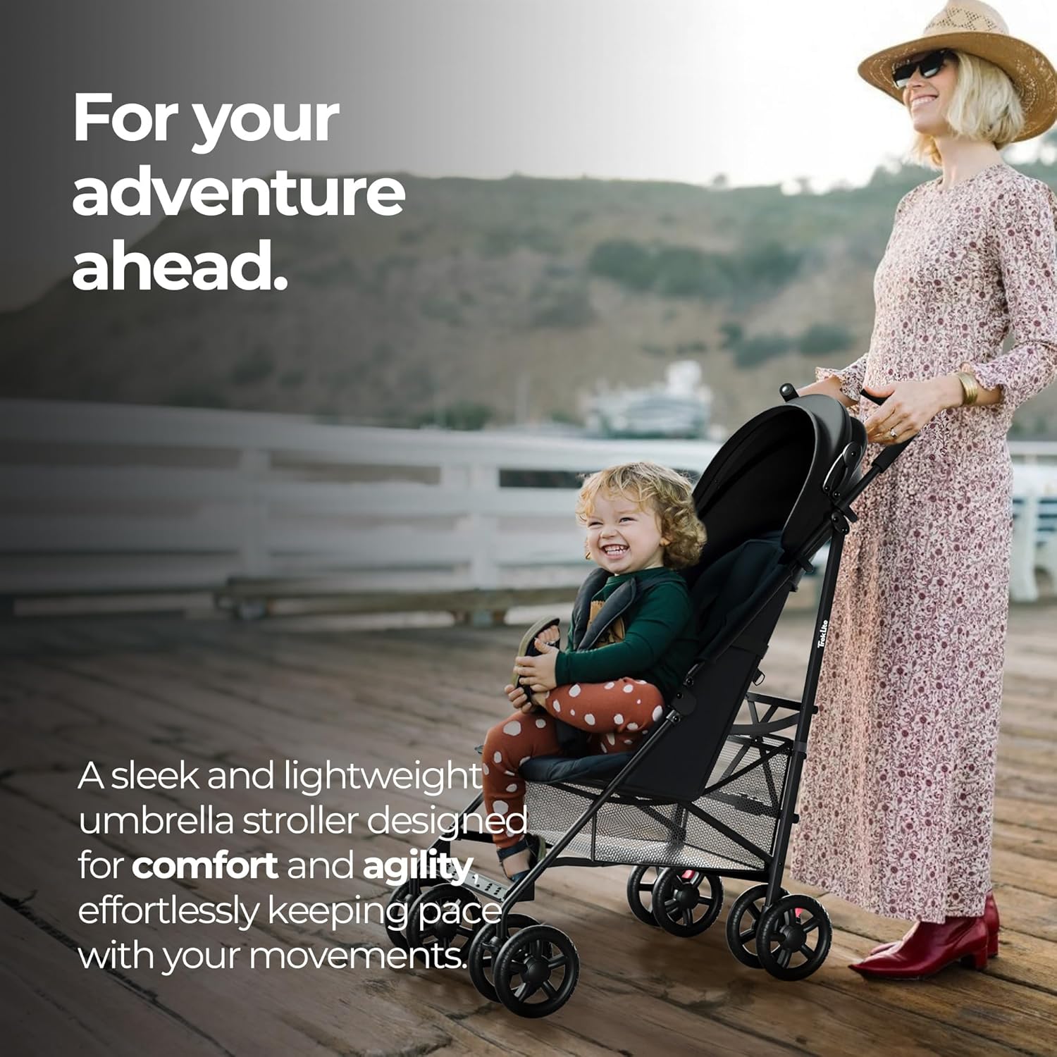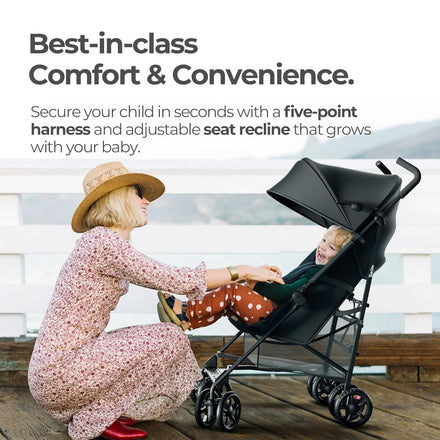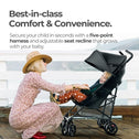 • Cuddle in Motion: Ensures your child's comfort with multi-recline positions, perfect for on-the-go naps. The Trek Lite compact stroller features a large UPF 50+ canopy for protection and a five-point harness for safety, adjusting easily as your child grows