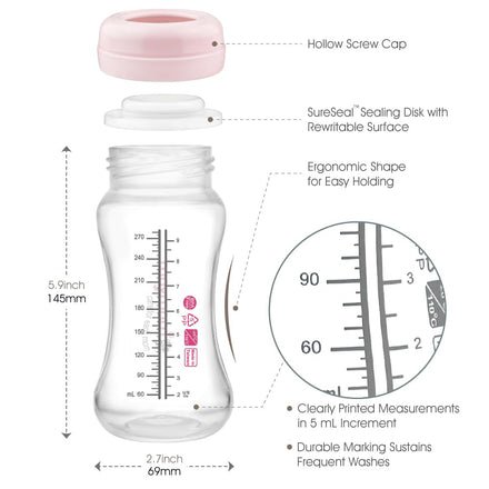 Maymom Wide-Mouth Milk Collection Storage and Feeding Bottle with Nipple, Pink Dome Cap, Bottle Top, SureSeal Sealing Disk; Compatible with Spectra Pump/Motif Luna; 2 pc (9Oz/280mL)