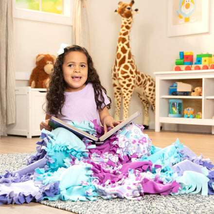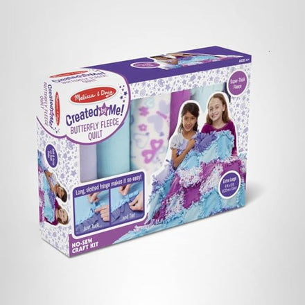 Melissa & Doug uses top quality, thick, fuzzy and super-soft material in this fleece blanket kit, which provides children with a warm and cozy finished product. The slotted fringe design of each square included in our fleece tie blanket kit makes for easy tying and assembly. The Created by Me Butterfly Fleece Quilt makes a great gift for kids ages 6 and up. Add the Melissa & Doug Multi-Craft Weaving Loom for another enriching and engaging activity. When the blanket has been assembled, it measures 5’ wide x 4’ long and weighs only 2.5 pounds.