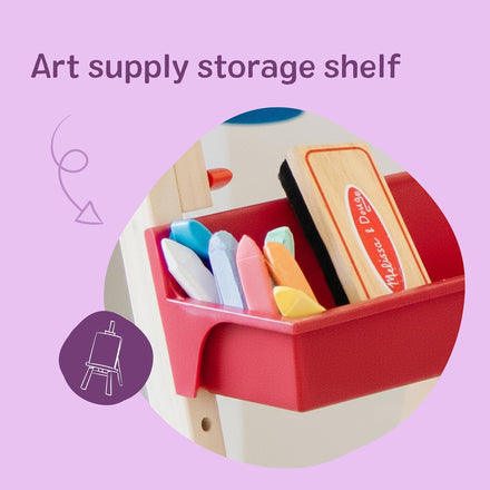 Details: The Melissa & Doug Deluxe Standing Art Easel invites kids to explore drawing, painting, and writing through hands-on, screen-free play. One side features a dry-erase board, the other a chalkboard, plus a locking paper roll holder for painting and sketching. Four easy-clip grips hold artwork in place, while two large trays keep supplies within reach. A child-safe paper cutter adds functionality, and the sturdy wooden frame adjusts in height and folds flat for storage. Designed for independent use, this easel supports early learning through tactile experiences. Kids can experiment with lines, shapes, and letters while developing fine motor control and pencil grip. Paper, paint, brushes, and chalk are sold separately, allowing for flexible setup. Ideal for ages 3 and up, this easel turns everyday play into a purposeful activity that encourages exploration and practice. For more creative fun, combine this with the Melissa and Doug Shape, Model, and Mold Play Clay, Paint, Drawing Supplies and the Giant Giraffe or Burrow Bunny, to be your models for practicing your sketching and painting skills For 35+ years, Melissa and Doug has crafted imaginative preschool toys and durable wooden toys built to nurture childhood wonder, with everything from a life-sized grocery store playset to a play kitchen playset and play food to serve plush toys & puppets, to costumes, arts & crafts, and road trip activities for kids. It’s the kind of kid-powered play that builds independence and confidence! This product is certified by the Forest Stewardship Council. FSC certification ensures that products come from responsibly managed forests that provide environmental, social, and economic benefits, and that forests are protected for future generations. Please note that FSC certification applies to new inventory only (FSC C156584)