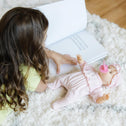 Jenna is the ideal, sweet smelling, first-born baby doll. Even the youngest caregivers will love her sweet face and soft, cuddly body (and grown-ups will love her wipe-clean arms and legs!). She is "pretty in pink" from head to toe, in a removable smocked outfit and matching cap. Her eyes open and close, and she can suck her thumb or her pacifier (included).
