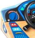 • Realistic play steering wheel mounted on a sturdy wooden dashboard with lights, sound effects, and moving parts, including a scrolling GPS