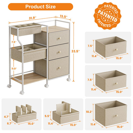 Modanais Baby Organizer and Storage Cart - 3 Tier Baby Rolling Cart with Dividers and Drawers, Easy to Assemble, Mobile Utility Cart with Wheels for Nursery, Bedroom, Changing Table & Crib,Off White