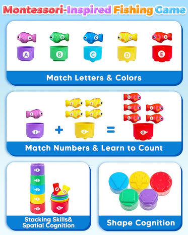 • Integrating Learning with Enjoyment: As babies enjoy the fishing game, this early learning toy helps them learn numbers and letters, color & shape recognition, matching, counting, sorting & stacking abilities. Plus, stacking the cups helps kids build spatial awareness, naturally sparking their interest in learning as they play. It is an effective way to develop fine motor skills while having fun.