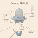 • SENSORY EXPERIENCE DELIGHT:We designed this feeder to be a sensory delight, entertaining your baby with the soothing rattle sounds, lovely ice-cream shape, and easy-to-grip handle. These sounds and shapes stimulate the auditory, visual and tactile senses, promoting cognitive development. To avoid dropping the feeder, simply attach to strollers or high chairs with the heart-shaped hole at the bottom.