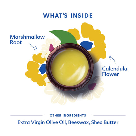 • Clean Ingredients: Extra virgin olive oil, beeswax, shea butter, marshmallow root, and calendula flower. All organic. Nothing else.