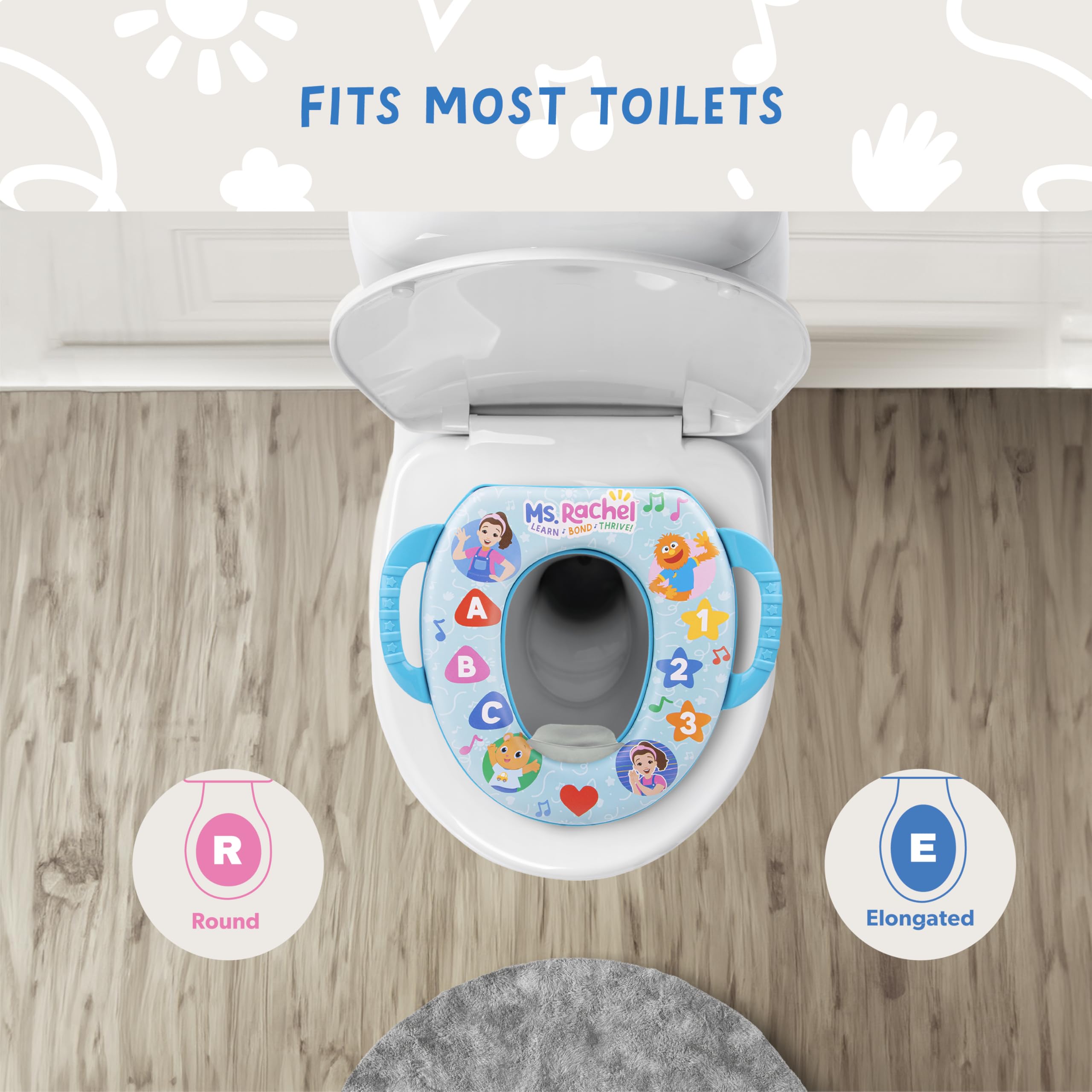 Details: Ms. Rachel helps little ones face potty training with a smile with this cute, colorful Ms. Rachel Soft Potty Seat! There’s no better way to encourage children to start using the adult toilet than with their favorite Ms. Rachel characters. The seat is made with durable plastic, heavy-duty vinyl, and a soft foam core that holds up over time. Soft cushioning is a welcome alternative for kids versus hard plastic seats. The patented Easy Grip Handles help little ones feel safe and secure on the toilet and aid in building independence throughout the potty-training process. To keep this potty seat hanging around, there is a potty hook that can be inserted into the space on the back of the seat. Hang the seat on the toilet tank or elsewhere in the bathroom for easy storage! Also included is an easy to install, contoured splash guard that redirects unwanted, messy splash-backs that may occur during potty training. All components come apart for easy cleaning that gets every inch. This potty seat fits on most regular and elongated toilet seats, so it is ready to use anywhere in the house.