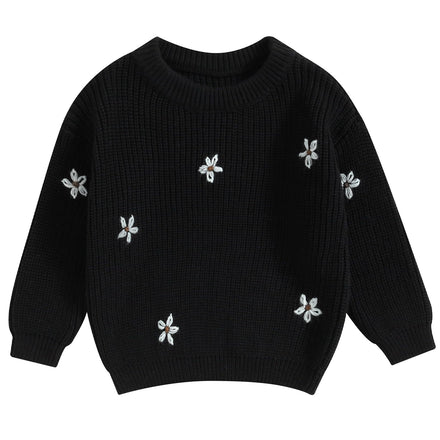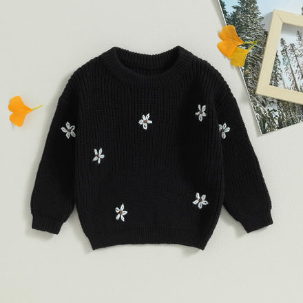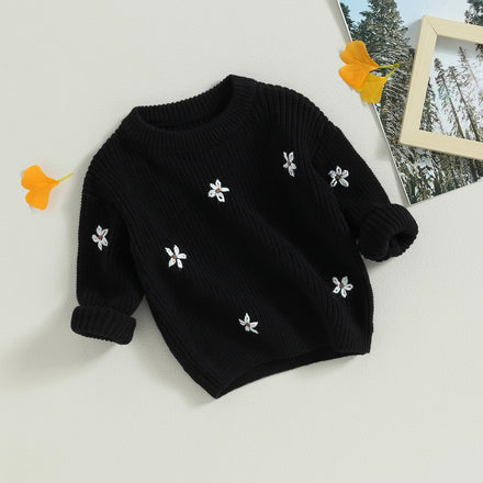 • Comfy Crewneck, Long Sleeve, Cute Flower Embroidery Sweater, Knitted, Infant Baby Newborn Girls Toddler Girls Fall Winter Pullover Knit Sweater Tops Clothes