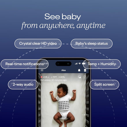 • Always-on monitoring: Check on baby from anywhere with 1080p HD video livestream, hear and speak to baby with 2-way audio monitoring, and view up to two cameras at once with Split Screen, which lets you add an additional camera for expanded smart monitoring capabilities. Enjoy features like night vision, sound + motion alerts, tracking temp + humidity of baby’s room, and soothing baby to sleep with a selection of nature sounds, white noise, or lullabies.