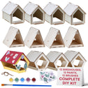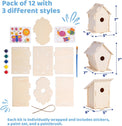 Neliblu DIY 12 Wooden Bird House Kits - Creative Arts and Crafts Set for Kids and Adults - Unfinished Wood Birdhouses with Paint Strips, Brushes, Stickers and Strings - 3 Unique Shapes, 2 Sizes