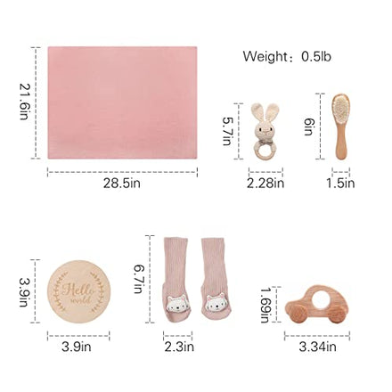 • Excellent Set - Are you nervous about being a parent and completely unsure of what to prepare for your child? Do you want to give your child warmth and comfort but not know how to choose? This set will be your excellent choice. It contains a baby blanket, baby brush, baby socks, wooden rabbit rattle, wooden milestone card, wooden car toy. These can completely meet the needs of the child from birth to toddler.