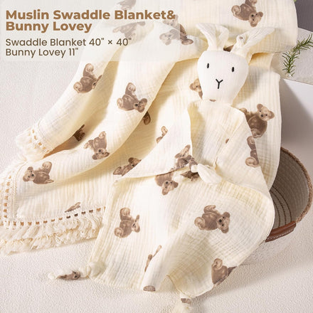 - 【Matching Baby Swaddle Blanket & Bunny Lovey】Both the swaddle blanket and bunny lovey are made from a double layer of 100% cotton, offering a soft, breathable feel that helps newborns stay cozy and comforted. Designed in matching tones to coordinate with each gift set variation, they add a timeless, photo-ready touch to baby’s first days.