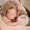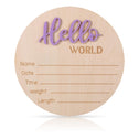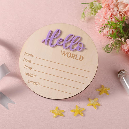 Newborn Announcement Sign, 5.9in Wooden Hello World Sign Baby Welcome Sign Birth Baby Name Plaques for Newborn Boys and Girls Photo Props Baby Shower Hospital Nursery (Light Purple)