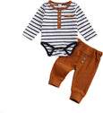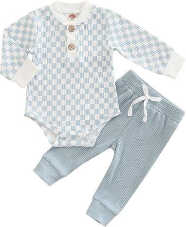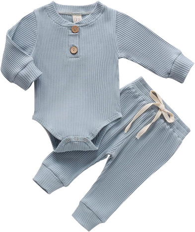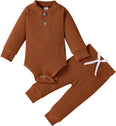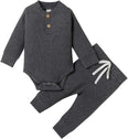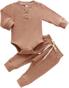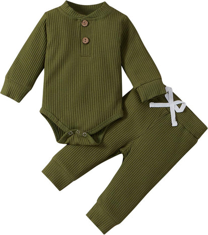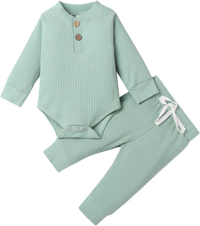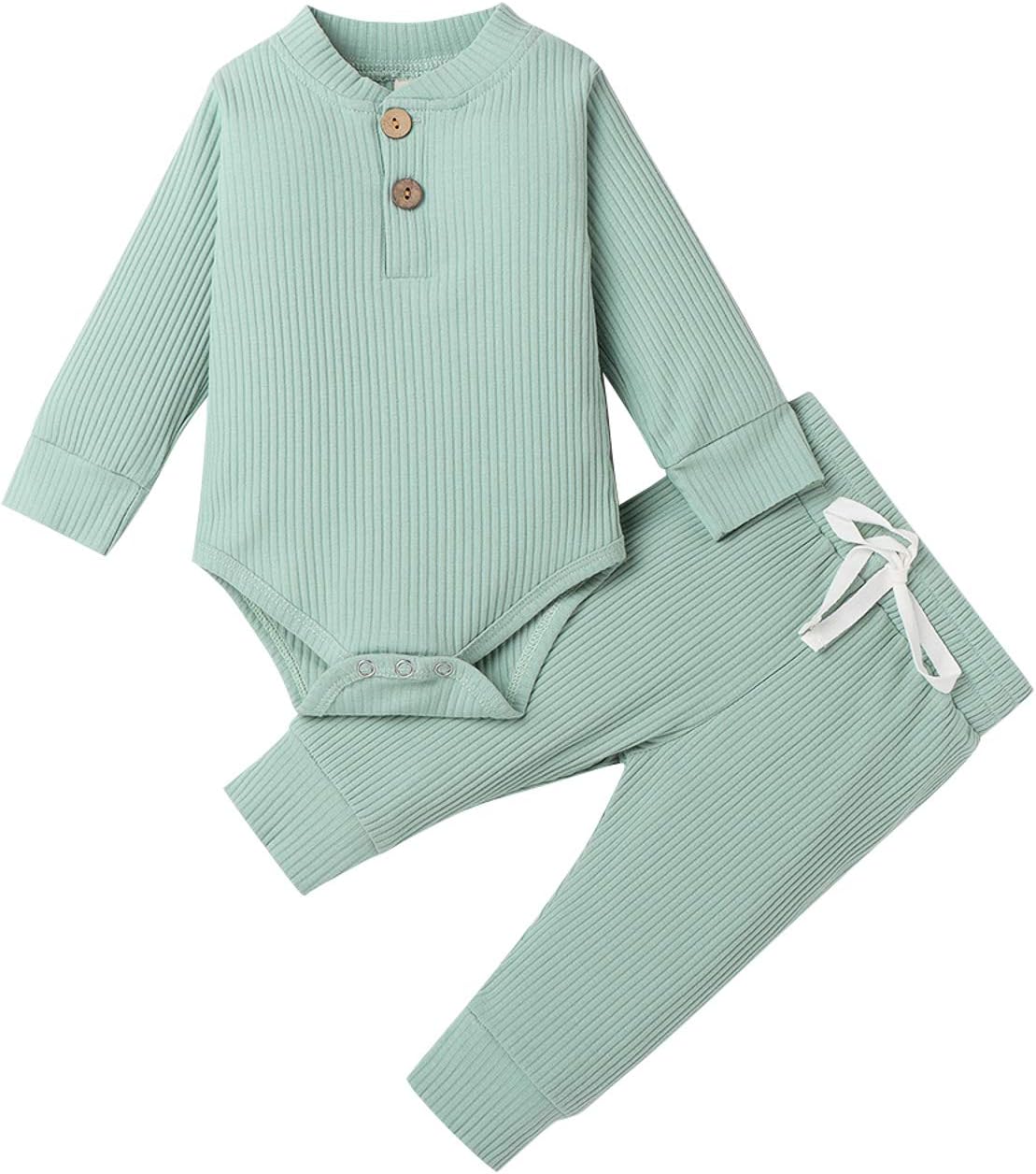 • ♥ [Cute Style]: Pull On closure. Two-Piece unisex baby pjs set. Solid color v-neck and button design, ribbed long sleeve romper top matching drawstring long pants. Simple yet stylish. Perfect for spring/fall/winter.
