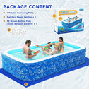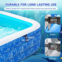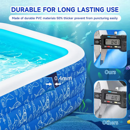 • DURABLE & SAFETY MATERIAL: Our inflatable pool is made with 0.40mm thickness PVC environment-friendly materials, 50% thicker than most in the market, reducing the risk of punctures. The thicken bottom doesn't tear easily. The repair patch in the package can extend the service time of the pool. Also, the full-size inflatable pools with a white-edge wall protects you from ultraviolet rays