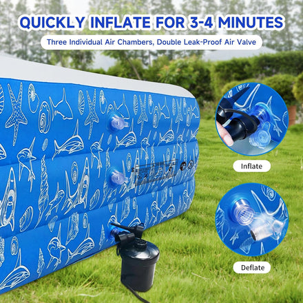 • EASY TO USE: Our family inflatable swimming pool is very easy to setup, just choose a flat location in your yard, inflate in 3-4 minutes by electric pump (NOT INCLUDED), fill the pool with water or balls and enjoy. Fast deflating or draining with the full-sized inflatable pool's double air-valves and drain plug