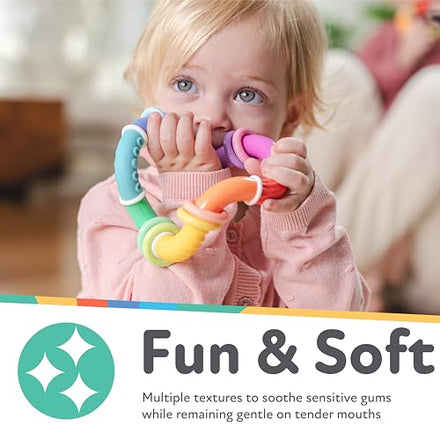 - TEXTURED BABY TEETHER: This teether toy features multiple textures to soothe sensitive gums while remaining gentle on tender mouths