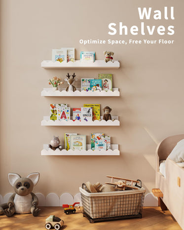 Nursery Book Shelves, 4-Pack White Floating Shelves for Wall Kids, Scalloped Shelves, Wall Book Shelves for Bedroom Kids, Toddler Room, Baby Room, Nursery Decor