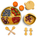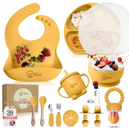 O'doe 17-Piece BPA-Free Silicone Baby Feeding Set | Thick & Soft Suction Plates, Baby Bowls, Wooden Fork & Spoon, and More | Make Mealtime Fun and Easy for Your Little One (Yellow, V2)