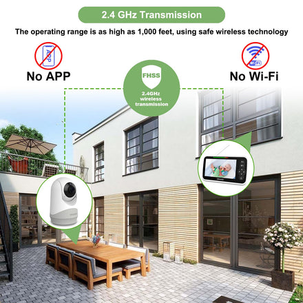 • Safety Baby Monitor:Our Baby Monitor Adopts Advanced 2.4GHz FHSS and Digital Encryption Technology, Low Latency, No Wifi and No App, You Don’t Need to Worry about The Risk of Being Hacked, The Transmission Range is Up to 1000 Feet, You Can Live Broadcast at Home Without any Worries.