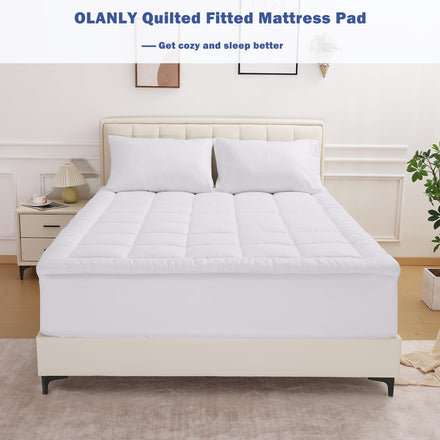 OLANLY Queen Quilted Fitted Mattress Pad, Elastic Fitted Mattress Topper, Cooling Soft Mattress Cover Stretches up to 21 Inches Deep, Machine Washable Mattress Protector (60x80 inch, White)