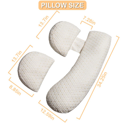 • Our maternity pillow, designed specifically for pregnant women who may encounter challenges such as a large abdomen, back pain, incorrect sleeping position, fetal malposition, edema, or poor sleep