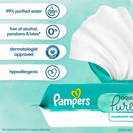 • TRUSTWORTHY: Pampers Aqua Pure baby wipes are from Pampers, the #1 pediatrician recommended brand, and Pampers Aqua Pure Baby Wipes, 99% Water, Hypoallergenic Unscented are Skin Health Alliance Dermatologist Approved, safe for baby’s sensitive skin