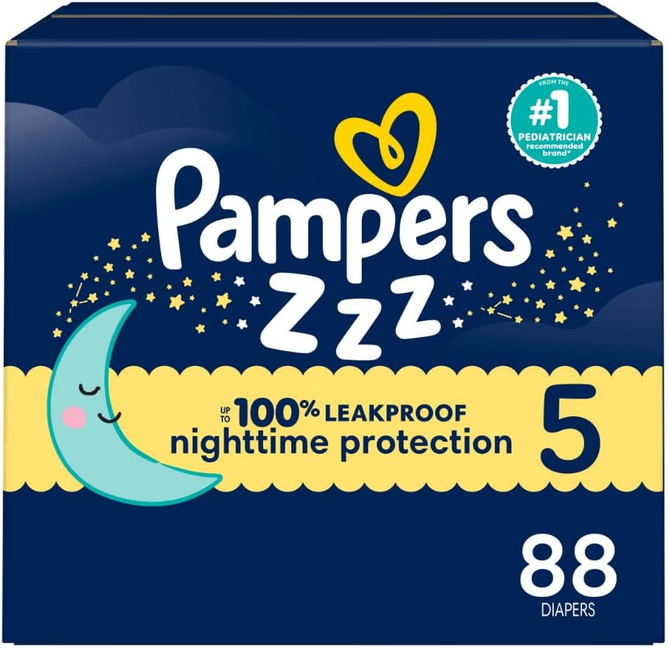 Say goodbye to overnight leakage with Pampers Swaddlers Overnights. Our nighttime diapers feature a Blowout Barrier at the back waist to help prevent leaks up the back of the diaper for enhanced overnight protection. Featuring 50% more absorbent zones than ordinary diapers* to help distribute wetness evenly and keep baby's skin dry and comfortable all night long. Less leaks mean more restful sleep. With Pampers Overnight Diapers, you can rest assured that you have superior absorbency, while keeping baby's skin dry and healthy, no matter how baby sleeps. The BreatheFree Liner in Overnight Diapers size 3-7 wicks away moisture, allowing baby's skin to breathe, while the LockAway Channels pull wetness into the core of the diaper to help prevent irritation. Also, our overnight diapers feature Dual Leak-Guard Barriers at the legs to help protect where leaks happen most. These nighttime diapers are dermatologist approved by the Skin Health Alliance, hypoallergenic, and free of parabens and latex, so you can trust them to be safe and gentle on your little one's delicate skin. Size 3-7 overnight diapers feature eight sweet nighttime prints. For trusted protection, trust Pampers, the #1 pediatrician recommended brand.** Product and packaging may vary. Download the Pampers Club App today and earn Pampers Cash*** Redeem your Pampers Cash for exclusive Pampers coupon savings and rewards. *Swaddlers Overnights vs. “leading value brand" ***Only redeemable via Pampers Club. No cash value. 0% PARABENS AND LATEX: Latex-natural rubber