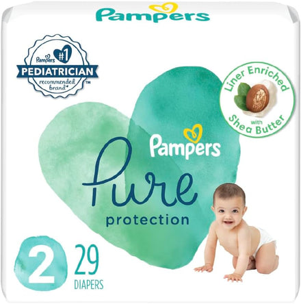 Your search is over. Everything you’ve been waiting for in a diaper, you’ll find with Pampers Pure. Our most premium protection for your newborn. MADE FOR SKIN HEALTH We've carefully crafted Pampers Pure diapers with plant-based ingredients and a shea butter infused liner that moisturizes to help nourish baby's skin. Pampers Pure Protection diapers are irresistibly soft and breathable. Now with NEW & IMPROVED softness! 2x softer than Honest diapers to help keep your baby comfy. Our luxury diapers are approved by the Skin Health Alliance. Use with Pampers Pure Aqua wipes to help protect baby's skin. LEAKAGE PROTECTION Up to 100% leakproof plant-based skin protection*. Pampers Pure Protection features an absorbent Lockaway Core that stays 2X drier** for healthy skin and a Blowout Barrier that helps prevent blowouts. PROTECTION YOU CAN TRUST The ingredients we've chosen to leave out are just as important. That's why Pampers Pure Protection diapers are free of elemental chlorine, fragrance, parabens, and latex***and are hypoallergenic. All Pampers diapers are assembled in the U.S.A. Discover trusted skin protection from the #1 pediatrician recommended brand. PREMIUM DESIGN Our designer, boutique style prints make Pampers Pure just as precious as they are protecting for your baby girl or boy. *Liner enriched with plant-based, skin-soothing ingredients **vs Honest ***No natural rubber