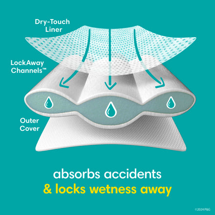 Details: Start your potty training journey with Pampers Easy Ups Potty Training Underwear for Girls and Boys! Featuring your favorite characters – Bluey and My Little Pony - these super soft, comfortable, and breathable training pants fit just like real cotton underwear allowing your toddler to feel like they have transitioned out of diapers! With a 360 stretchy waistband that is gentle on your child's skin, Easy Ups make it easy for your toddler to pull up and down their training pants independently. For easy changing, Easy Ups feature easy tear sides for convenience, even on the go! When it comes to potty accidents, your toddler will be covered with up to 100% leakproof protection Day OR Night. To protect where leaks happen most, Easy Ups are made with Dual Leak-Guard Barriers around the leg cuffs and Extra Absorb Channels for all around coverage to absorb accidents and lock them away from your toddler's skin. Plus, they're dermatologically tested, hypoallergenic, and free of parabens and latex.* That's just one of the many reasons Pampers is the #1 pediatrician recommended brand. Toilet training is a journey and can take your toddler 90 days on average to catch on. So, Pampers Easy Ups makes it easy with each box containing a one-month supply of training pants. Available in sizes 2T-3T (16-34 lb), 3T-4T (30-40 lb), 4T-5T (37+ lb) and 5T- 6T (41+ lb).*Natural Rubber
