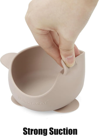 PandaEar 3 Pack Silicone Suction Baby Bowls & 3 Baby Feeding Spoons | Non-Slip Stay Put Bowls & Soft Silicone First Stage Spoons for Toddlers, BPA-Free Baby Led Weaning Set (Linen Brown Tan)
