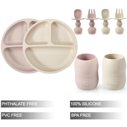 Details: PandaEar Silicone Baby Feeding Set| 2 Pack Silicone Divided Suction Plate and 2 Pack Tiny Cup with 2 Spoons 2 Forks| Baby Led Weaning Supplies Self Feeding Eating Utensils