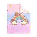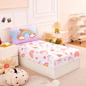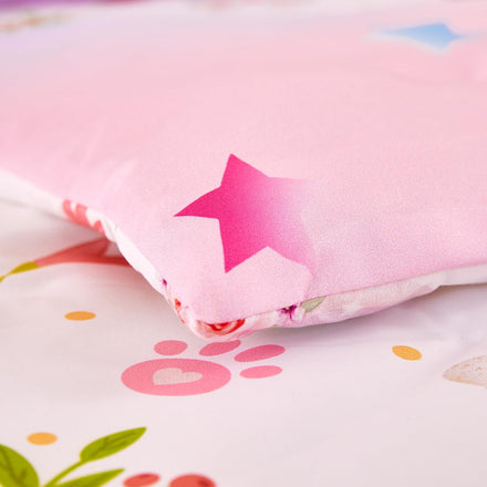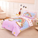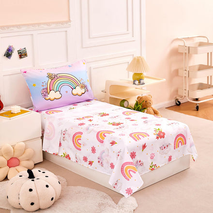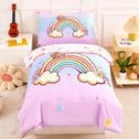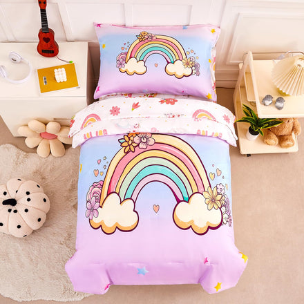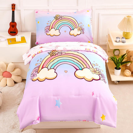 • 4-Piece Toddler Bedding Set: Pink rainbow toddler comforter set for girls includes: 1 toddler sized comforter: 42"x57", 1 flat fheet 45"x60", 1 fitted fheet 28"x52"+8", 1 pillowcase 20"x30". All pieces of this toddler bed set are measured to fit a standard size toddler bed.