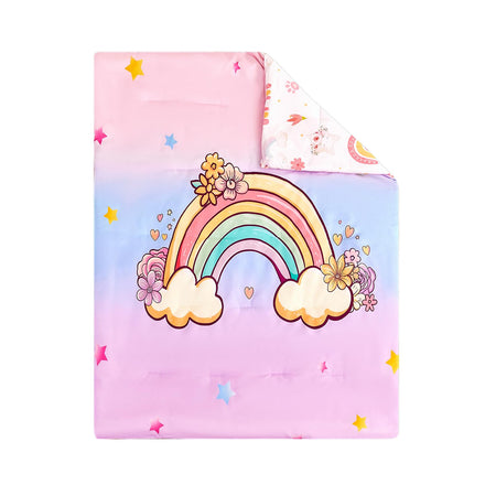 • Gift Idea: Reversible design rainbow toddler comforter set with sheets, A side is rainbow floral pattern and B side is rainbow star clouds pattern, both sides are colorful and full of innocence and imagination. This todder bedding comforter set can bring endless happiness and beautiful dreams to your little one, very perfect as a gift to baby, kids, and girls.