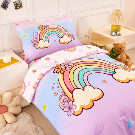 • Fabric: 100% microfiber polyester. This rainbow toddler bed comforter set is soft to the touch, providing a gentle warmth that is perfect for snuggling up with during story time or a good night's sleep. The lightweight and breathable toddler bedding help to offer a cozy and comfortable sleeping environment for your baby.