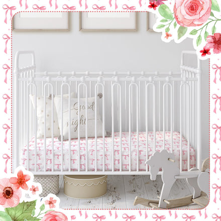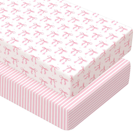 - Pink Bow Bed Sheet Set: includes 2 pcs baby bed sheets compatible with a 52" x 28" standard baby mattress; 4 sided elastic edging design, paired with an 8 inch deep pocket, provides a secure fit that is not easily displaced; 2 pcs bed sheet configuration, easy to change and wash, keep clean and ready for use at any time; Practical and thoughtful, creating a comfortable and reassuring sleeping space for babies