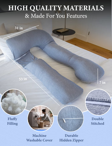 • The pregnancy pillow features a detachable extension that can be used as its own full body pillow, or attached the main body pillow for additional back or belly support, making this an excellent pillow for pregnant women and just about anyone else!