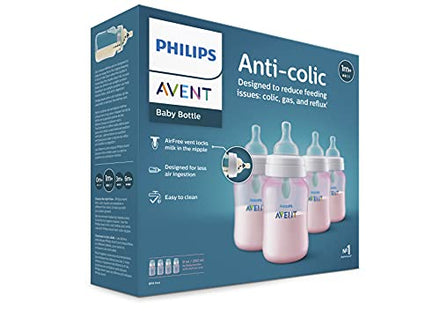 Details: Philips Avent Anti-colic with AirFree vent bottles are designed to reduce feeding issues: such as colic, gas, and reflux. The unique AirFree vent is designed to draw air away from the nipple keeping it full of milk to avoid air ingestion. This vent also keeps the nipple full of milk even when the bottle is held horizontal, allowing for upright feeding. Feeding in an upright position can help to reduce reflux and aid in digestion. The nipple shape is designed for a secure latch for a comfortable feed. The bottle is easy to clean and assemble with few parts. The AirFree vent is only one piece and is easy to clean without any special tools. The Anti-colic bottle features a valve, integrated into the nipple, that reduces vacuum buildup and reducing air into your baby’s tummy. The Anti-colic bottle can be used with or without the AirFree vent, giving you the option based on your baby’s feeding needs. The soft silicone nipple is available in different flow rates for babies of all ages, flows 1-4. We recommend using the Philips Avent Anti-colic baby bottle with Philips Avent Anti-colic bottle nipples. Includes 4 Pink, 9oz, Anti-colic bottles with AirFree vent with Flow 2 nipples. SCY703/14