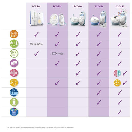 Details: Enjoy peace of mind with the Philips AVENT SCD501/10 DECT Baby Monitor. DECT technology guarantees zero interference from any other transmitting product like other baby monitors, cordless phones and cell phones. It also provides high quality, crystal clear sound so you can hear your baby anytime. The five sound-activated LED lights alert you of the noise level in your baby's room even when the parent unit is muted. If your baby is restless when you put them to bed, you can help soothe and calm your baby to sleep with the warm tranquil glow of the night light. With a range of 300m you can be fully mobile in and around the home. The parent unit can be outlet or battery powered using AA batteries (not included).