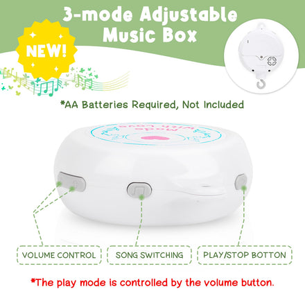 • 12 Soothing Lullabies: The newly upgraded 3-mode adjustable music box lets you choose between Rotation Only, Music Only, or Both. As the gentle melodies play, the toys slowly spin, creating a calming atmosphere that makes bedtime a smoother and more enjoyable experience for both baby and parents
